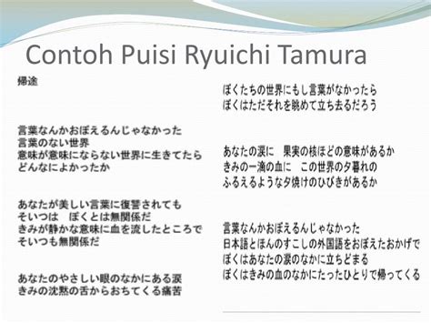 Selain itu, melalui puisi ini, kita juga dapat belajar tentang budaya dan filosofi yang dimiliki oleh bangsa Jepang. Seperti yang kita ketahui, Jepang memiliki kekayaan seni dan sastra yang sangat beragam, salah satunya adalah puisi.